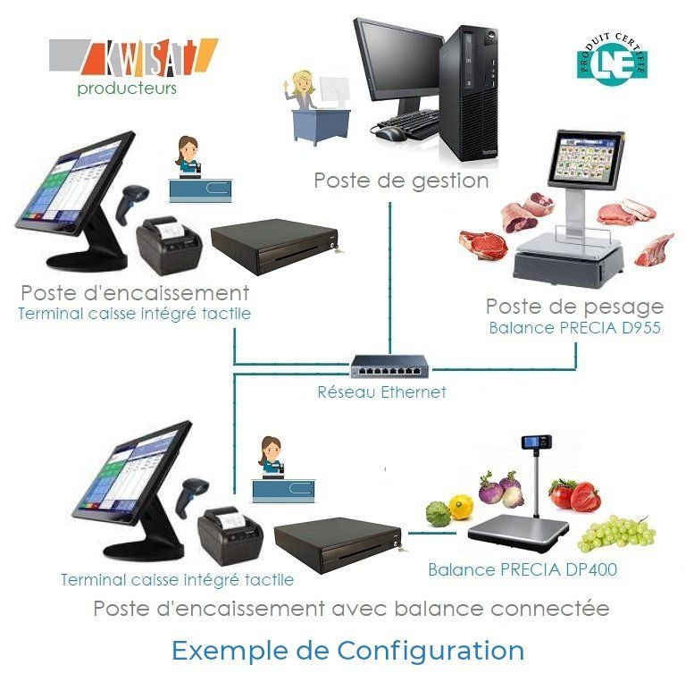 - Pesage en caisse : Pour vos produits pesés en caisse, pas de double saisie, KWISATZ dispose d'une connexion certifiée avec les balances PRECIA, EXA, Mettler, Bizerba, Marquès.