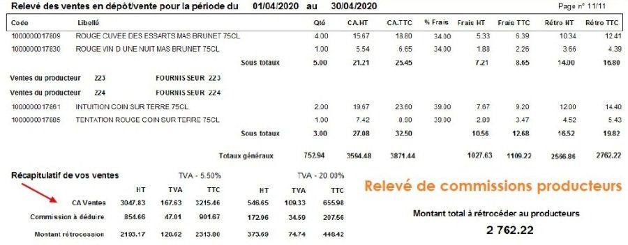 Cette étape permet d'imprimer ou d'envoyer par mail, les relevés de commissions et de générer automatiquement les factures de rétrocession pour chaque déposant (voir exemple ci-dessous).